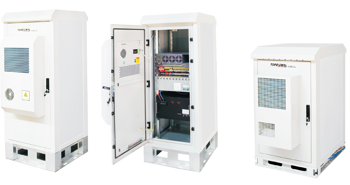 机柜防护等级IP55, 采用冷轧钢板框架, 前开门, 机柜侧面和背面是45毫米厚隔温阻燃夹芯板。柜门采用内嵌式结构, 门缝均匀紧凑, 开门角度>110°,柜门安装有门限位装置,柜门采用拉杆加锁片三点结构式机械锁, 结构牢固, 具有防撬功 能, 防盗性强, 门上安装有1500W半嵌入式工业空调调温,整体美观、便于搬运、维护方便、恒温、防水防尘、可满足不同 区域各种环境使用要求。